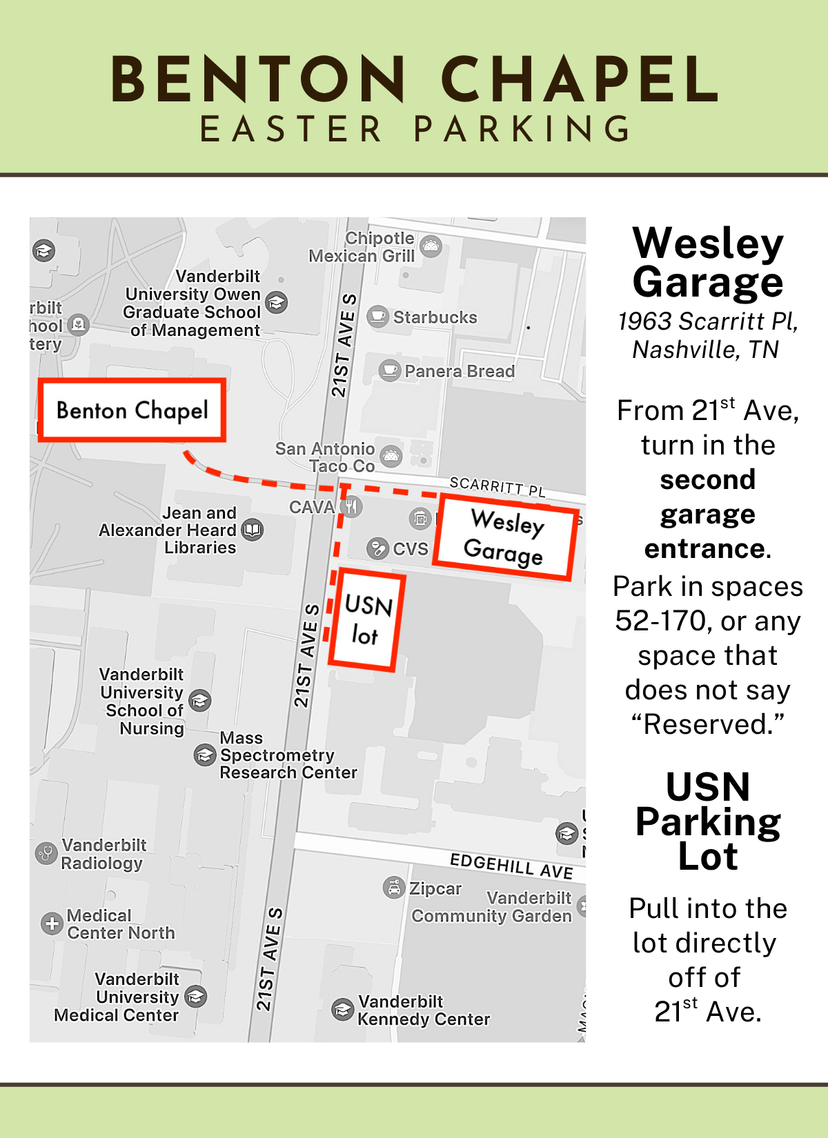 Where to park for Easter? You can park at the University School of Nashville or we have reserved parking for Easter Sunday.