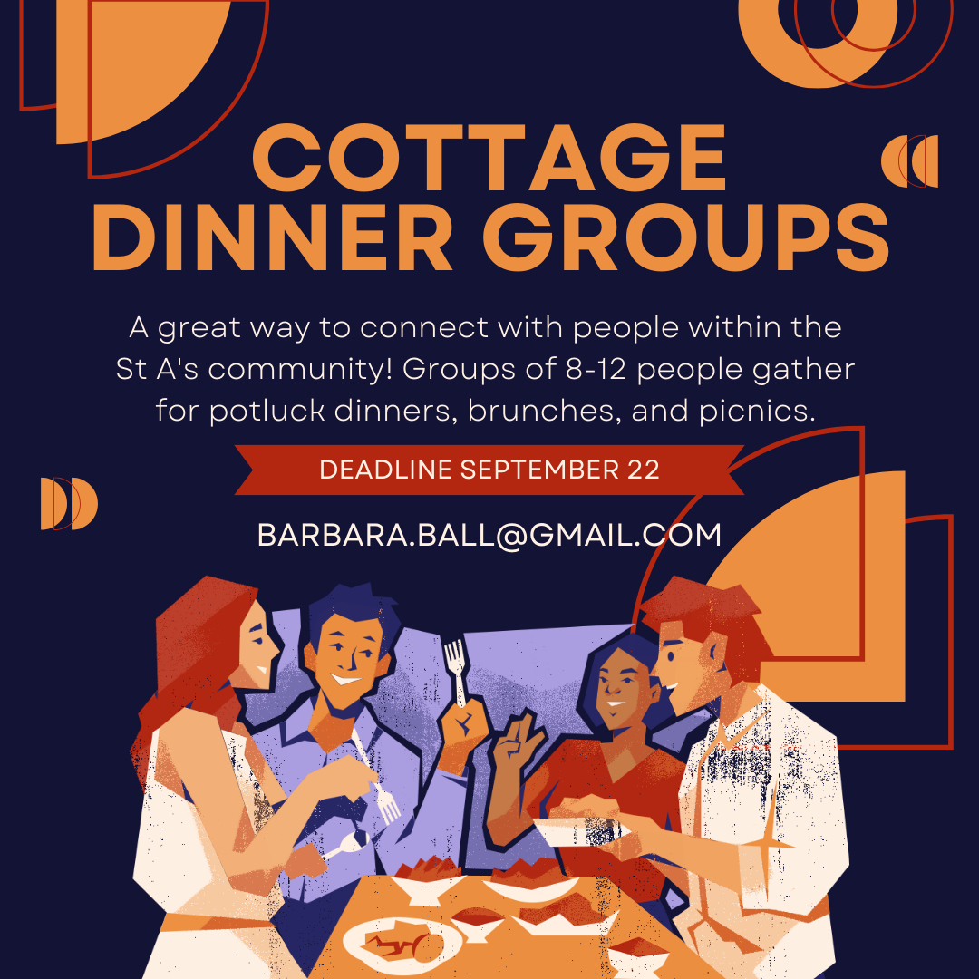 Cottage Dinner groups are starting up again! They're a great way to connect with people within the St A's community. Groups of 8-12 people gather for potluck dinners, brunches, picnics and live music. There are groups for people in their 20s and 30s, families with kids, and people over 40.